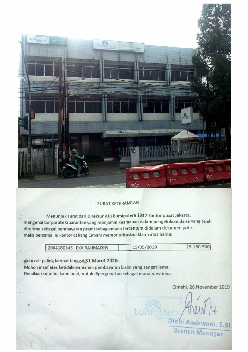 Rini pernah beberapa kali mendatangi Bumi Putra Cabang Cimahi, tapi hasilnya selalu nihil, sampai pihak Bumi Putra mengeluarkan surat keterangan yang ditandatangani oleh kepala cabang tertanggal 22 November 2019, yang mana isinya menerangkan, bahwa sebelum akhir Maret 2020, uang pemegang polis atas nama Eka Rahmadhy akan dibayarkan,tetapi kenyataanya sampai berita ini diturunkan tidak ada pembayaran tersebut.