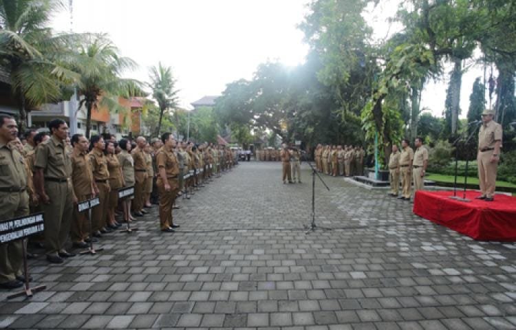 GIANYAR-BALI, (PERAKNEW).- Apel yang dilaksanakan tepat di Halaman Kantor Bupati Gianyar, begitu terasa istimewa. Pasalnya, apel yang dipimpin Bupati Gianyar, A.A Gde Agung Bharata merupakan apel terakhir dirinya menjabat sebagai Bupati Gianyar. Karena pada tanggal 21 Februari 2018 yang akan datang, Bupati Agung Bharata akan mengakhiri masa jabatannya sebagai Bupati Gianyar periode 2013- 2018.