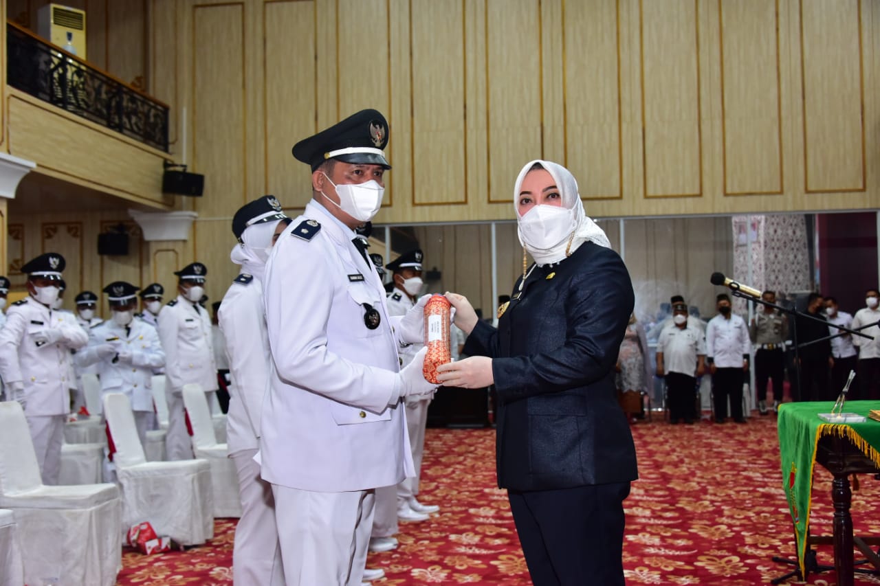 MURA-SUMSEL, (PERAKNEW).- Bupati Musi Rawas (Mura), Provinsi Sumatera Selatan, (Sumsel), Hj Ratna Machmud melantik 111 (Seratus sebelas) Kepala Desa (Kades) Terpilih dari Pilkades Serentak tahun 2021, di Auditorium Pemerintah Kab. Mura, Rabu (30/06/2021).