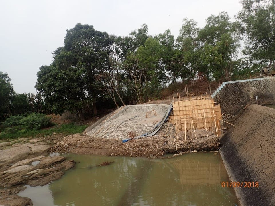 Diawali pada item pekerjaan pembangunan tembok tebingnya, menggunakan batu-batu bekas bangunan bronjong di bendungan tersebut.
