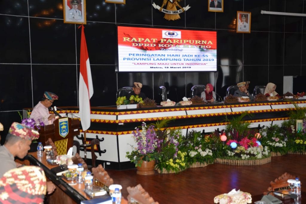 METRO-LAMPUNG, (PERAKNEW).- Peringati hari jadi Provinsi Lampung ke- 55 Tahun 2019, Dewan Rakyat Perwakilan Daerah (DPRD) Kota Metro menggelar Rapat Paripurna Istimewa, di Gedung DPRD Kota Metro, Senin 18 Maret 2019.