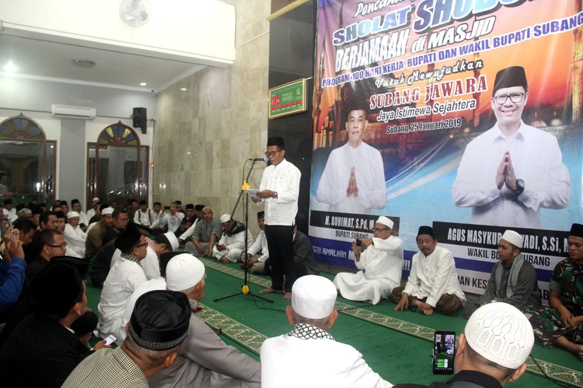 SUBANG, (PERAKNEW).- Pencanangan gerakan sholat shubuh berjamaah di masjid dalam rangka program 100 hari kerja Bupati dan Wakil Bupati Subang untuk mewujudkan Subang Jawara (Jaya, Istimewa dan Sejahtera) telah remi dimulai oleh Bupati Subang H. Ruhimat, S.Pd., M.Si di Masjid Agung Al-Musabaqoh Subang. Jum’at (25/1/19).