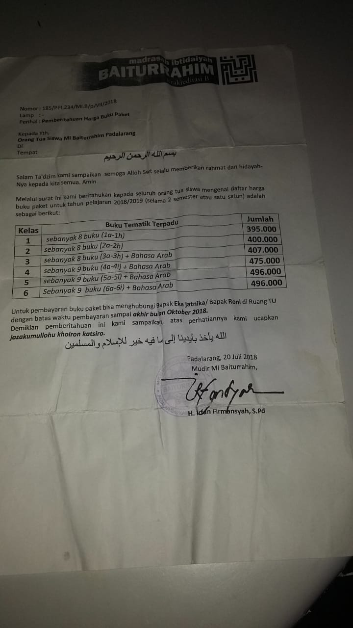 KBB, (PERAKNEW).- Terkait terbitnya surat pemberitahuan mengenai harga buku paket oleh Kepala Madrasah, H. Irfan Firmansyah, S.Pd., kepada para orang tua siswa.
