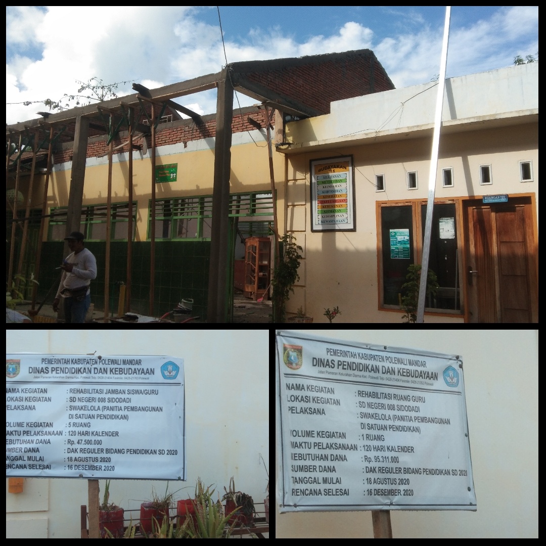 POLMAN-SULBAR, (PERAKNEW).- Berdasarkan hasil pantauan Perak di lapangan, terlihat ada pekerjaan rehabilitasi bangunan Ruang Guru dan WC Sekolah Dasar Negeri (SDN) 008 Sidodadi, di Kelurahan Sidodadi, Kecamatan Sonomulyo, Kabupaten Polewali Mandar (Polman), Provinsi Sulawesi Barat (Sulbar), Jum’at (25/9/20)