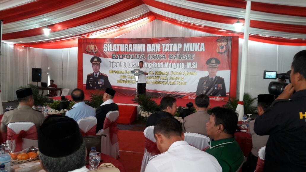 SUBANG, (PERAKNEW).- Pjs Bupati Subang, Drs. H. Dady Iskandar, M.M., menghadiri kegiatan silaturahmi dan tatap muka yang dilanjutkan dengan deklarasi anti hoak bersama Kapolda Jawa Barat, Irjen Pol Drs. Agung Budi Maryoto, M.Si., di Halaman Mapolres Subang, Rabu (21/03/2018).