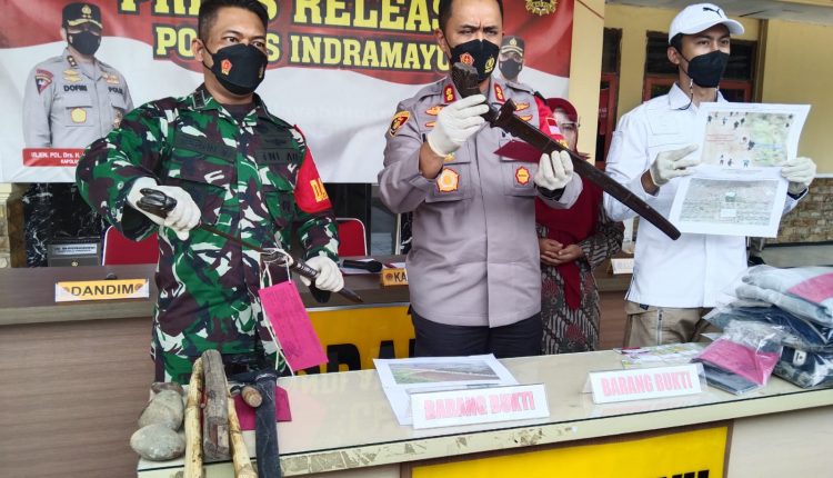 INDRAMAYU, (PERAKNEW).- Polres Indramayu gelar Pers Rilis terkait perkara bentrokan berdarah, hingga menimbulkan korban jiwa, dua orang meninggal dunia, pada Senin (04 /10/21) di kawasan lahan HGU PG Rajawali II Desa Sukamulya- Blok Makam Bujang, Kecamatan Tukdana, Kabupaten Indramayu, Provinsi Jawa Barat, di Mapolres Indramayu, pada Hari Rabu (6-10-2021).