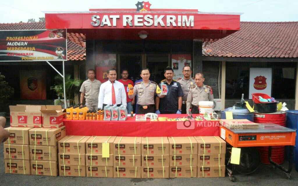 “Iya, tersangka memproduksi oli dengan jenis tertentu yang sudah terkenal dan laku dipasaran dengan menggunakan oli curah tanpa merk,” kata Kapolres Subang, AKBP Muhammad Joni didampingi Kasat Reskim, AKP Moch Ilyas dan Kasubag Humas, AKP Udi Sahudi saat konferensi pers di Mapolres Subang.
