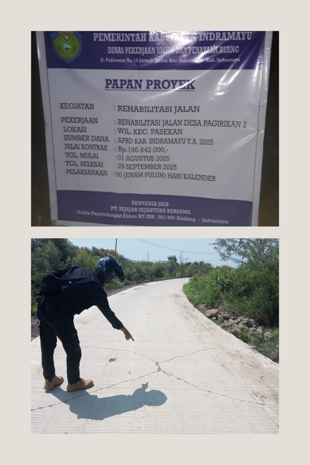 PERAKNEW.com – Proyek rehabilitasi jalan Desa Pagirikan, 2 Kecamatan Pasekan, Kabupaten Indramayu, Provinsi Jawa Barat, belum lama dikerjakan sudah banyak mengalami keretakan dan pecah-pecah. Hal ini diduga karena proses pekerjaannya asal-asalan, diantaranya diduga ada volume pekerjaan yang tidak sesuai Bestek atau Gambar Proyeknya.