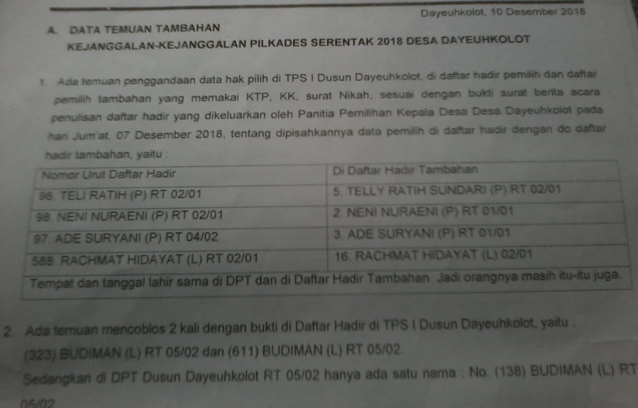 Dengan ditemukanya Surat Pemilih ganda atau hak pilih mencoblos 2 kali sebanyak 4 orang dengan nama yang sama, di daftar hadir mencoblos kemudian didaftar hadir tambahan mencoblos pula, dengan salah satu contoh bukti hadir di TPS 1 Dusun Dayeuh kolot yaitu dengan no. (323) Budiman (L) RT 05 RW 02 dan no. (611) Budiman (L) RT 05 RW 02, padahal di DPT hanya satu daftar nama orang tersebut.