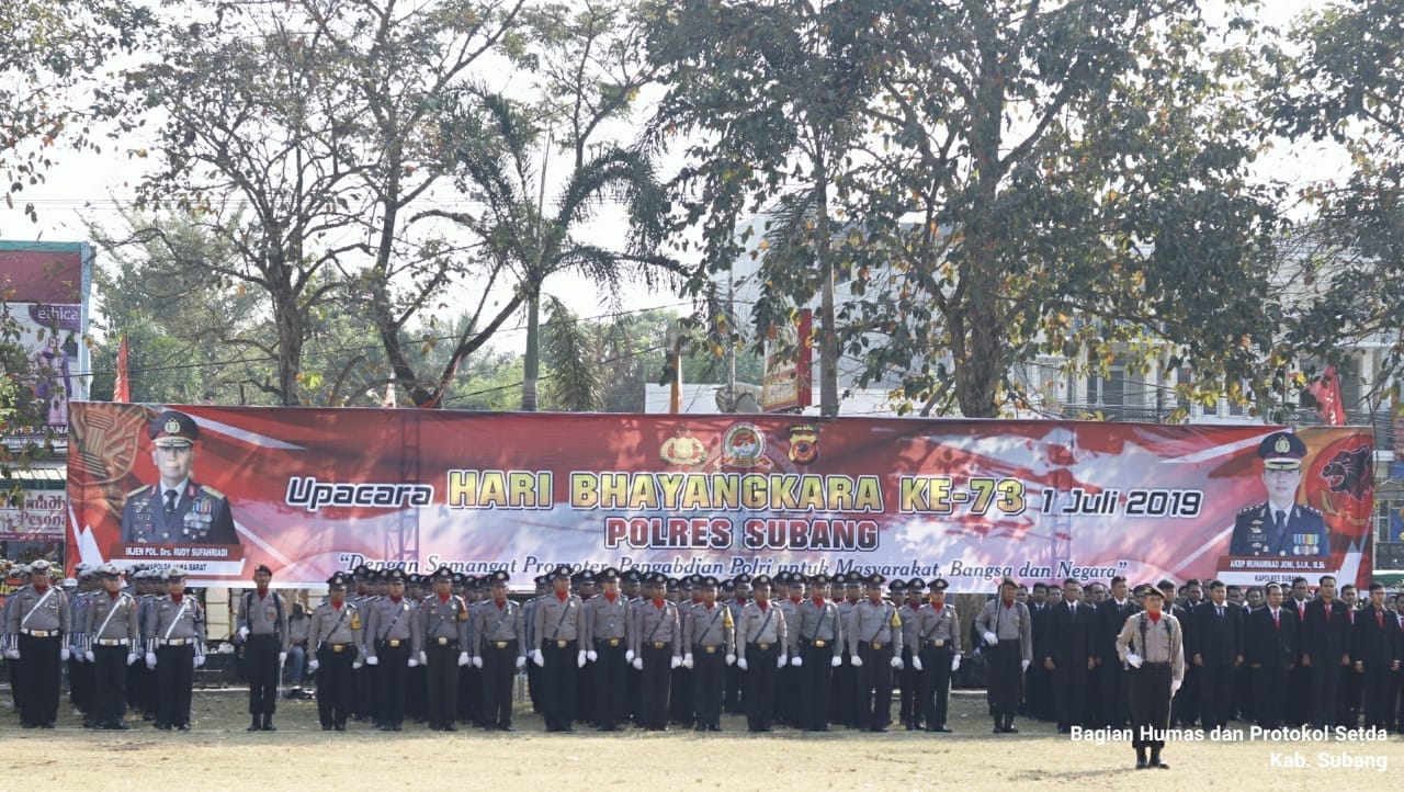 Kapolres Subang sebagai infekstur upacara membacakan amanat dan mengucapkan selamat Hari Bhayangkara ke-73, kepada seluruh anggota dan keluarga besar Kepolisian Negara Republik Indonesia, di mana pun Saudara bertugas dan juga mengucapkan terima kasih dan memberikan penghargaan atas kerja keras, pengabdian, pengorbanan, dan perjuangan tanpa pernah mengenal lelah, yang ditunjukkan personel Polri dalam memelihara keamanan dan ketertiban masyarakat, menegakkan hukum, serta memberikan perlindungan, pengayoman dan pelayanan kepada masyarakat.